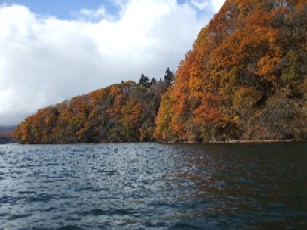 周囲16kmに広がる赤や黄色の紅葉と青い水面との