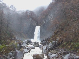 雨上がりで霧が立ち込める中にそびえ立つ苗名滝は