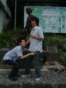 愛犬に犬なのに「クマ」という名前をつけた隊士と愛犬クマの像の前で