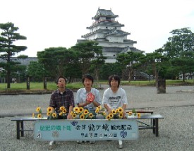 天守閣に登って会津市内を一望した後、天守閣を降りて城をバックにパチリ!