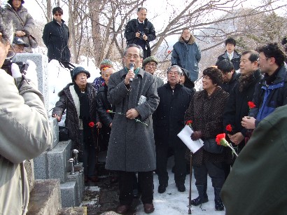 雪のそぼ降る中、多喜二の墓前で行われました墓前祭では、
